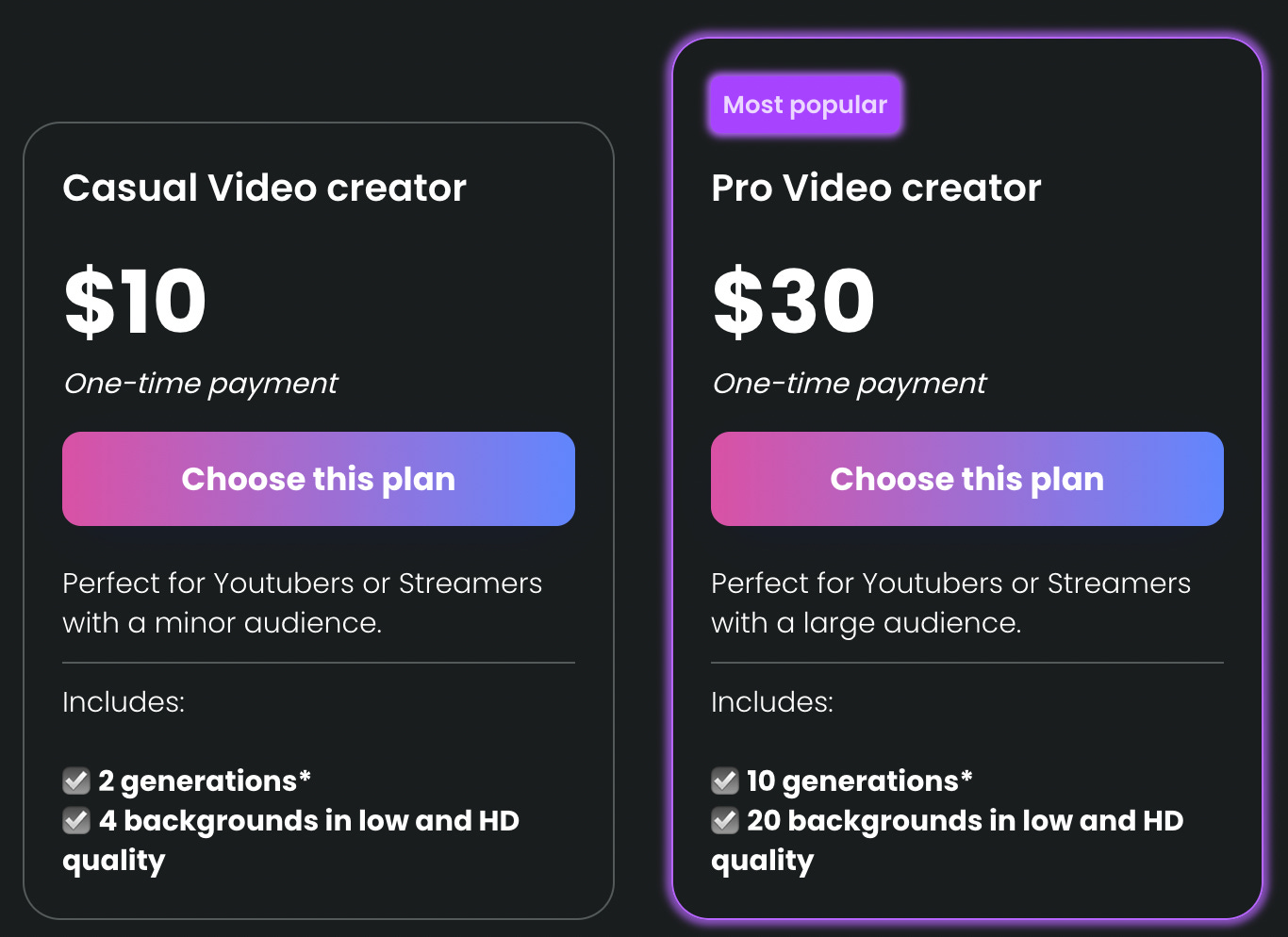 ✅ J’ai beaucoup réfléchi au business model. J’en suis arrivé au système suivant : je propose 2 “packs”, le premier à 10$ qui propose 2 générations (soit 4 backgrounds HD, sachant qu’on obtient 2 backgrounds par génération), et le second pack à 30$ qui propose 10 générations (soit 20 backgrounds HD).