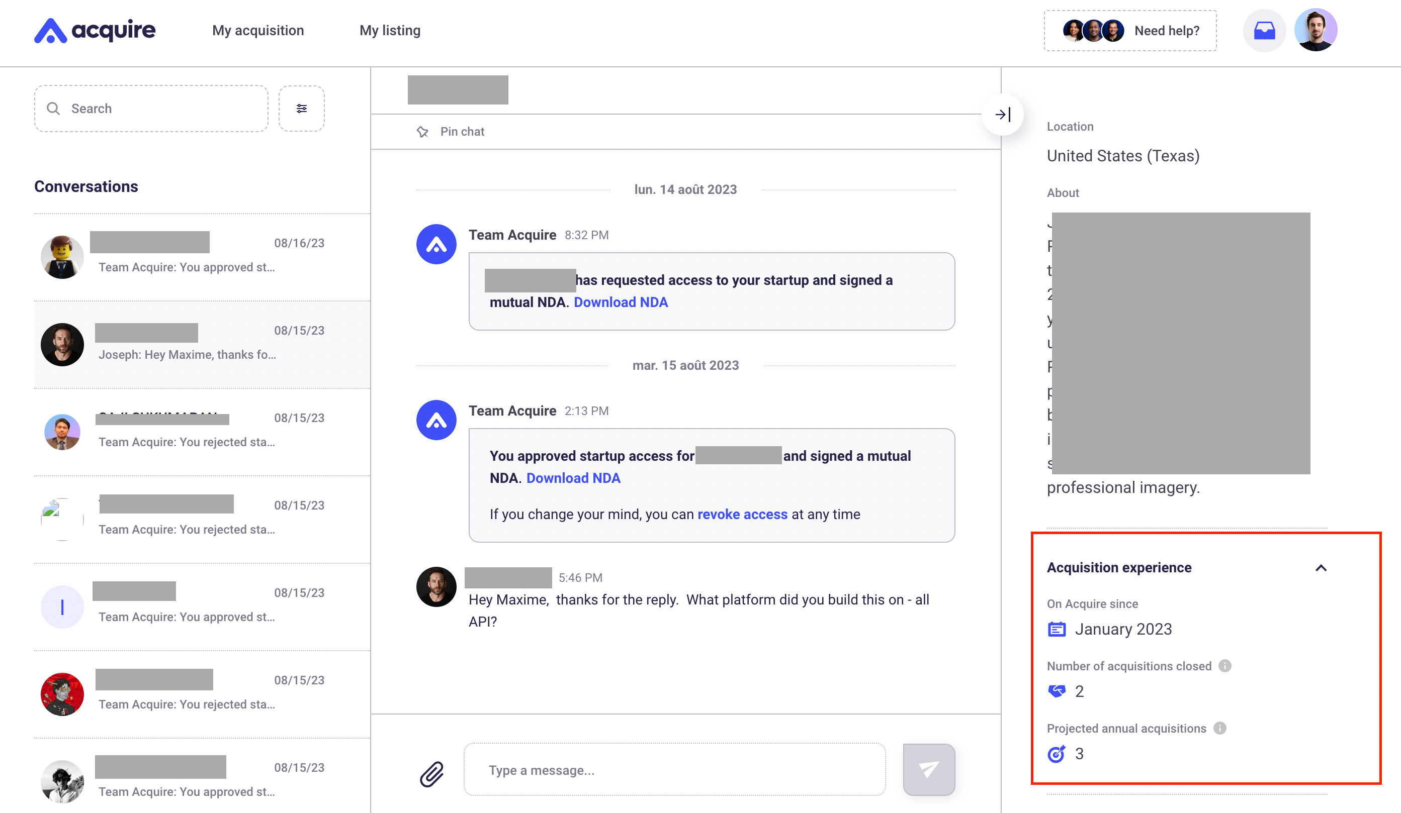 Lorsqu’une personne est intéressée par mon annonce (une description globale de l’application, le prix et le revenu), celle-ci doit signer l’accord (dont le template est fourni par acquire).